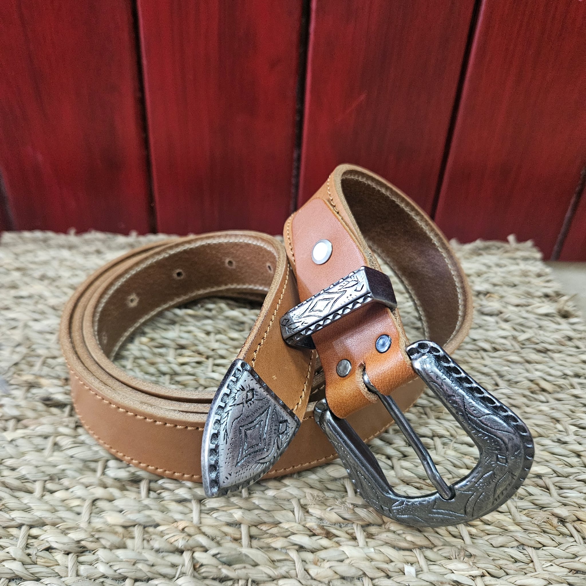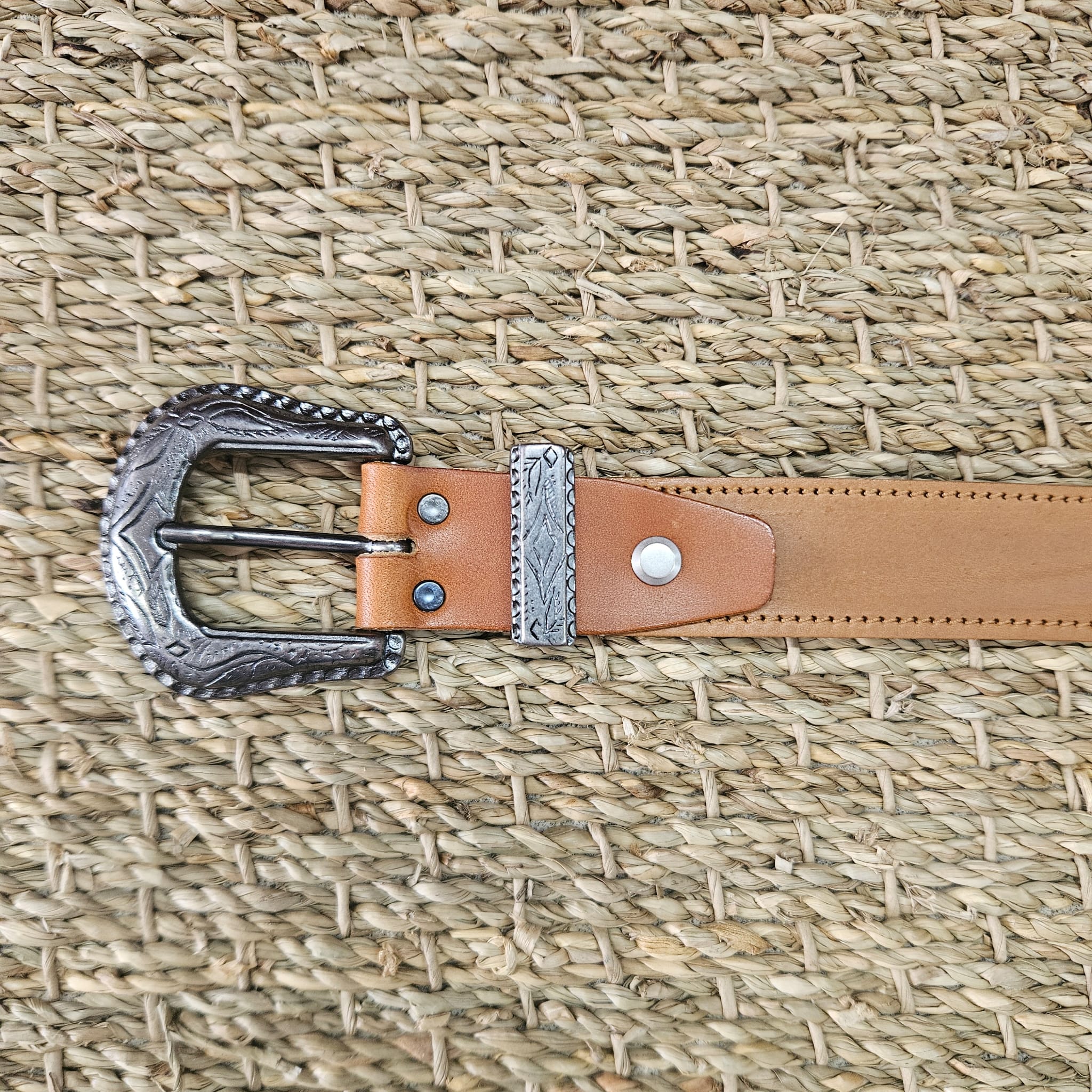 Ceinture en cuir de vachette de 3 cm de large et sa boucle western , elle convient à tous les passants de pantalon et mesure environ 110 cm. Vous l’adaptez à votre tour de taille, il vous suffit de vous munir d’un cutter et d’un appareil à faire les trous ( ou d’un clou et un marteau ).